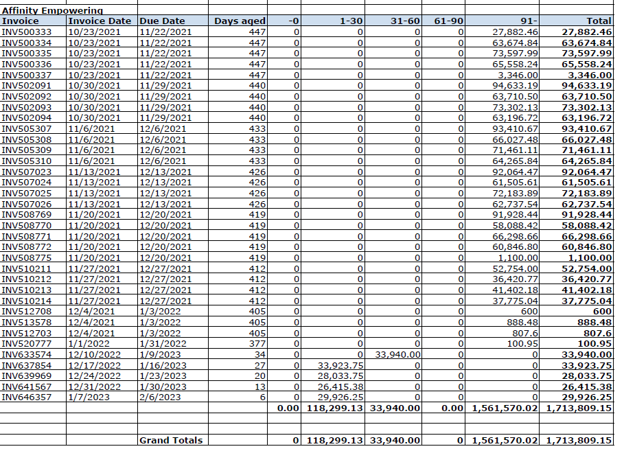 On January 18, 2023, Medix sued its client Affinity Empowering, Inc. for unpaid fees totaling $1,713,809. The work order attached to the Complaint indicates that the services supplied were "COVID testers," and there must have been a whole bunch of them. Here is the open account ledger attached to the Complaint: